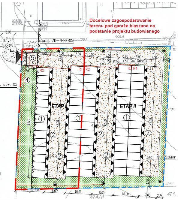 Docelowe zagospodarowanie nieruchomości opiera się na 70 sztukach garaży tj. 5 szeregów po 14 sztuk w każdym.